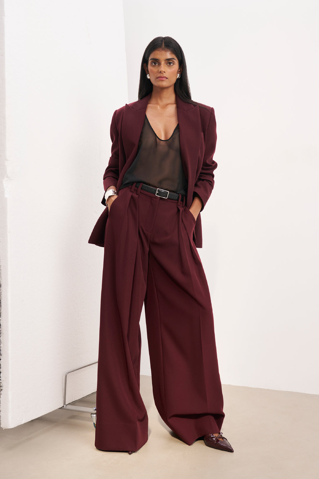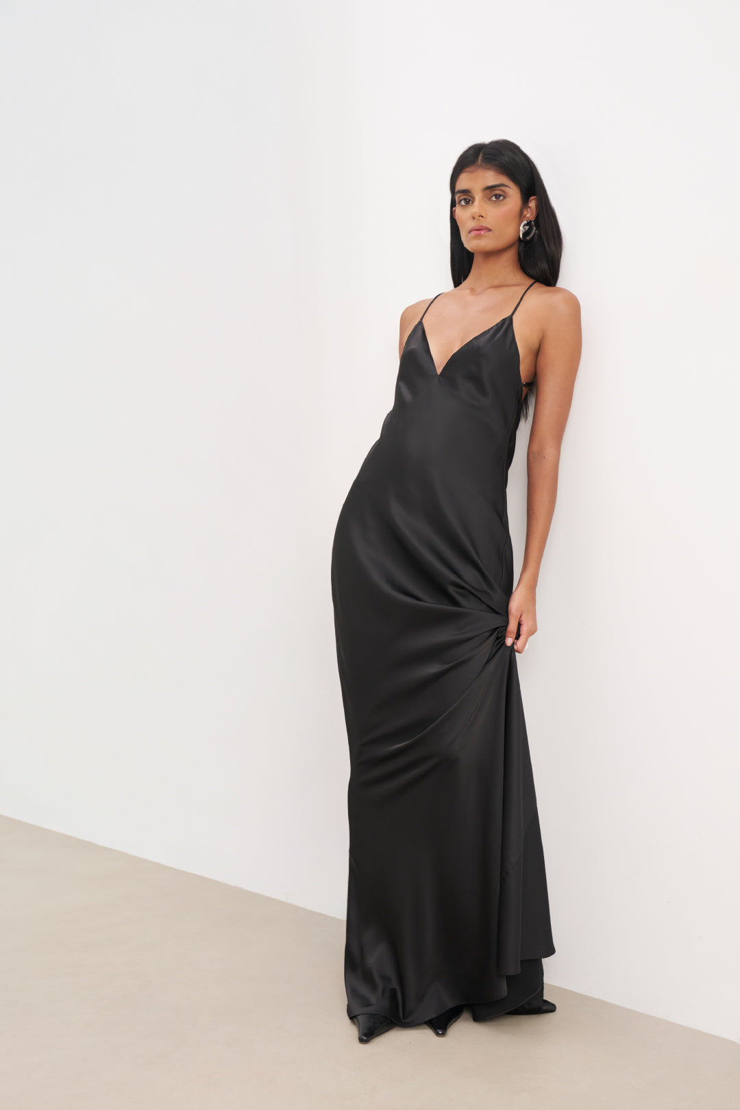 Formal cut wide leg trousers in a glossy, flowing mid-weight Satin fabric with a delicate bound trim waistband, mid rise cut and longline straight leg. Finished with an invisible side zip.