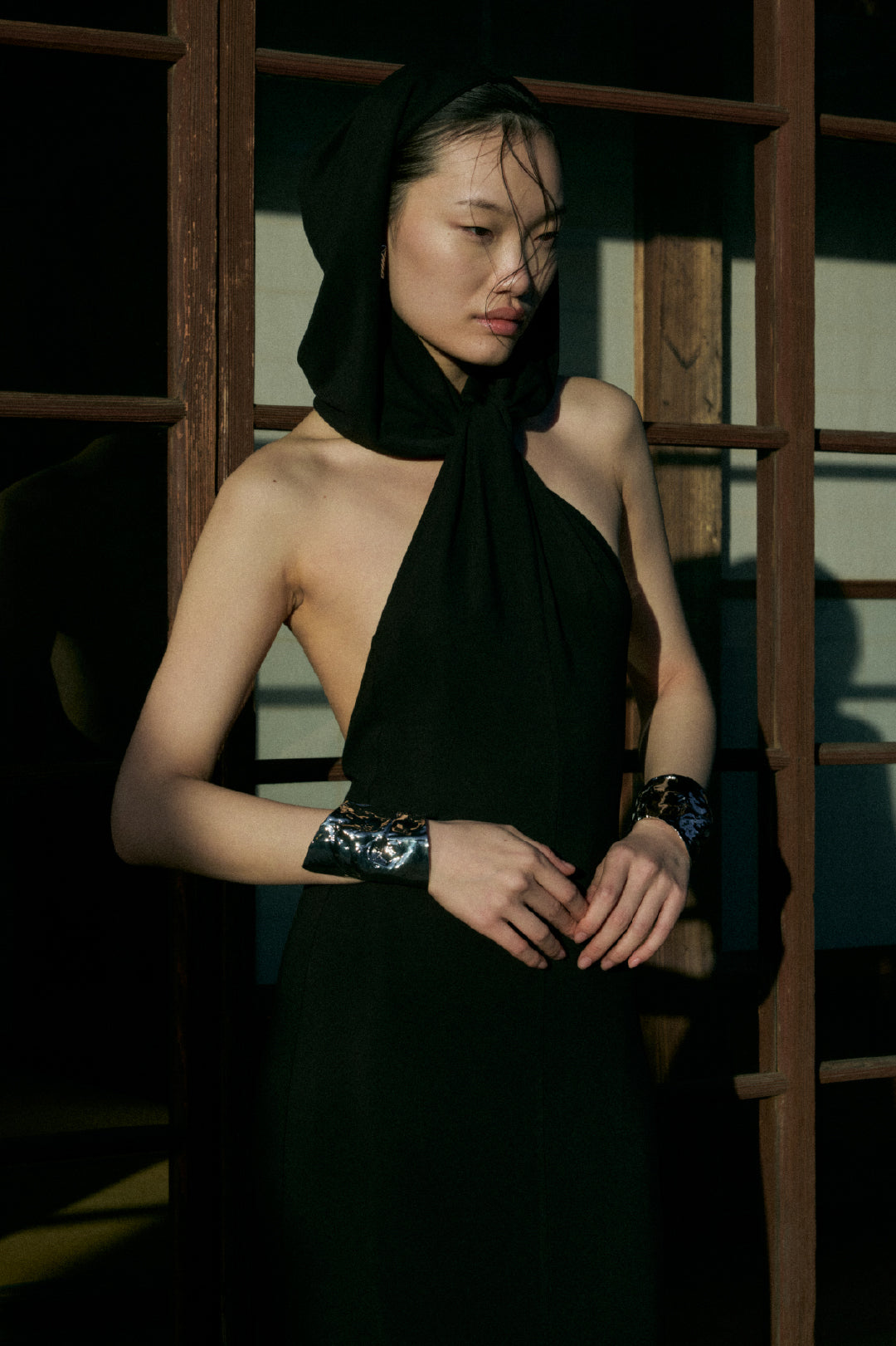 Triangle cut leather scarf with long ties in ultra realistic, buttery soft PU leather. A multi-way accessory designed to be worn as a scarf, strapless top, belt or headscarf.